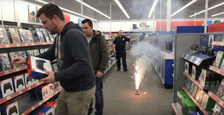 Dwóch mężczyzn postanowiło ukraść kontroler do gier, robiąc przy tym prawdziwy pokaz pirotechniczny między półkami! 🎮💥🚔