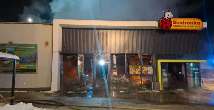 Ogień strawił budynek handlowy doszczętnie, a akcja gaśnicza trwała wiele godzin przy udziale ogromnych sił straży 🚒🚨